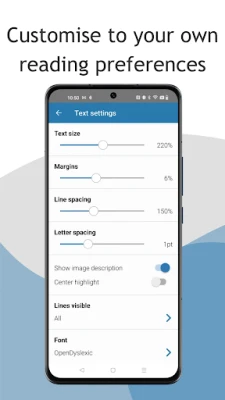 - Customise text, background colours and word highlights to improve readability