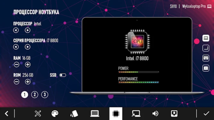 Where to begin? If you don't know what to do, take the first step. You came up with a unique name for your first laptop. A start has been made, now you need to come up with the exterior design of your dream laptop. Create whatever your heart desires - color; width; height; the thickness of the laptop; keyboard size; logo; screen size, resolution and technology; operating system, processor; video card, you can even choose the packaging in which your creation will lie!